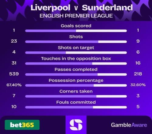 英超联赛第14轮,利物浦主场迎战战绩不俗的升班马桑德兰。下半场希姆斯丁·塔勒比远射折射破门,维尔茨禁区内射门造成穆凯莱的乌龙,终场前费代里科·基耶萨拦下了桑德兰的单刀。最终两队1比1在安菲尔德握手言和,利物浦连续三场英超主场不胜。