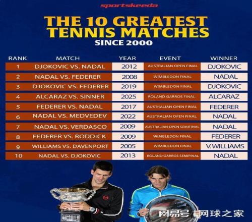 我们再来关注其它消息。最近,有外媒评选出了21世纪以来,世界网坛的十佳经典对决。在这十场较量中,男子方面的费纳德“三巨头”和新生代领军人物阿尔卡拉斯、辛纳都悉数上榜;女子方面则只有一场比赛入选。