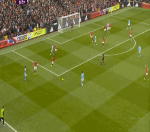 但是,曼城的后场拔升并不明显,所以在这次出球当中,姆贝乌莫的回撤接球依然轻松,阿克和罗德里都跟不上,这让曼联得以分到边路,完成了多尔古和阿玛德-迪亚洛的连线: