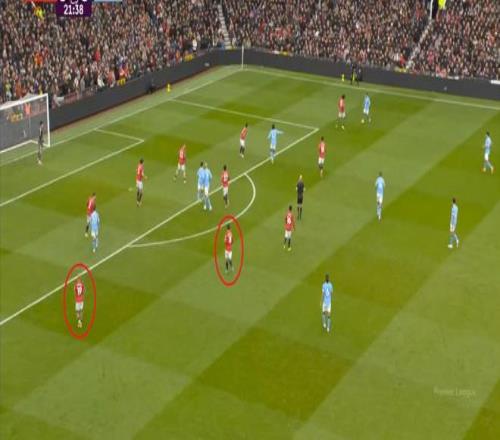 当然了,主场作战的曼联在开局阶段更需要展现强势,所以在向前的时候,利用人员层面自然可以拉开的宽度优势,曼联打得很坚决: