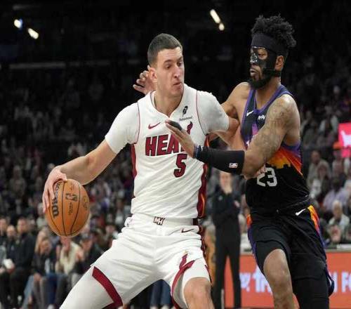 太阳上一场客场103-110输给老鹰,热火上一场客场147-116大胜爵士,本赛季首次交锋太阳客场121-127输给热火。本场太阳缺少布克与杰伦-格林,热火缺少米切尔、罗齐尔、希罗与韦尔。首节开局热火3-5落后,双方紧咬比分缠斗至热火13-15落后,热火一波9-0攻势反超7分。伊戈达罗内线得分,热火一波7-0攻势扩大12分优势,热火随后持续保持两位数领先优势,首节结束热火32-21领先太阳。首节热火24中10,其中三分仅8中1,鲍威尔8分与阿德巴约9分;太阳21中8,其中三分10中2,狄龙7分。